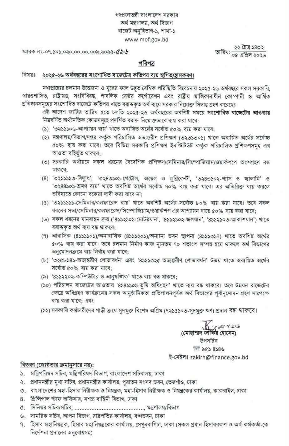 পরিপত্র; ২০২৫-২৬ অর্থবছরের সংশোধিত বাজেটের কতিপয় ব্যয় স্থগিত/হ্রাসকরণ